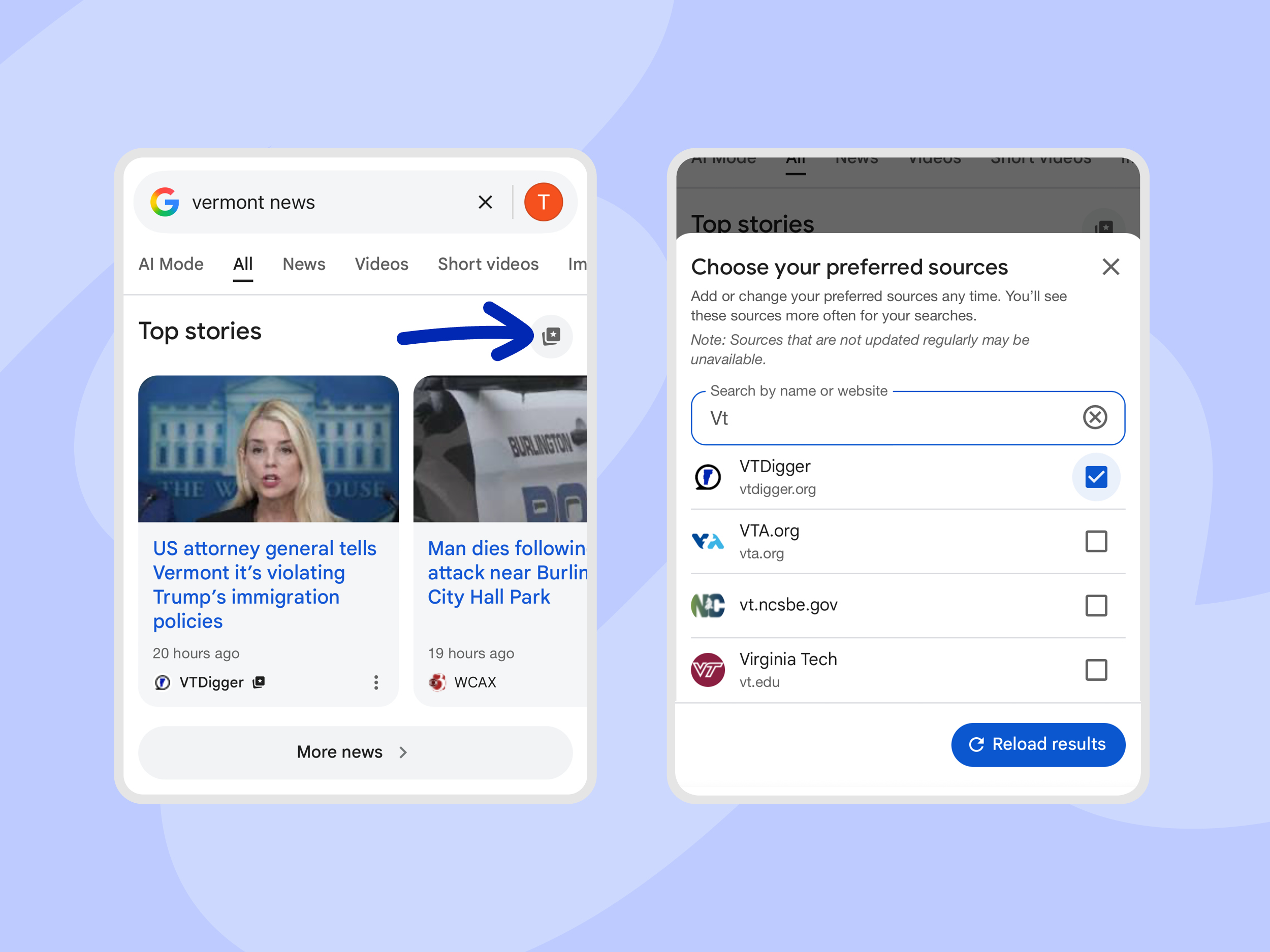 - You should now see VTDigger appear more often in Top stories and From your sources when we have fresh reporting related to your search.
